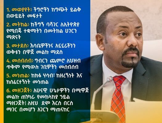1) መወያየት- ችግሮችን ከግጭት ይልቅ በውይይት መፍታት 2) መትከል- ከችግኝ ባሻገር ለኢትዮጵያ የሚበጁ ተቋማትን በመትከል ሀገርን ማጽናት 3) መታደስ- እሳቤዎቻችንና አኗኗራችንን ወቅቱን በዋጀ መልኩ ማደስ 4) መሰብሰብ- ግብርን ጨምሮ ለህዝብ ጥቅም የሚውሉ ገቢዎችን መሰብሰብ 5) መነጠል- ከክፉ ሃሳብን፣ ከዘረኝነት እና ከሰፈርተኝነትን መነጠል 6) መዘጋጀት- አሁናዊ ሁኔታዎችን በሚዋጅ መልኩ ጠንካራ የመከላከያ ኃይል ማዘጋጀት ፤ ለዚህ ደግሞ…